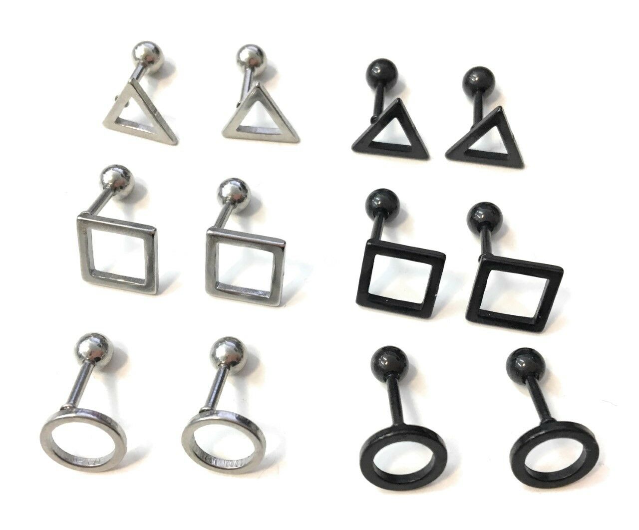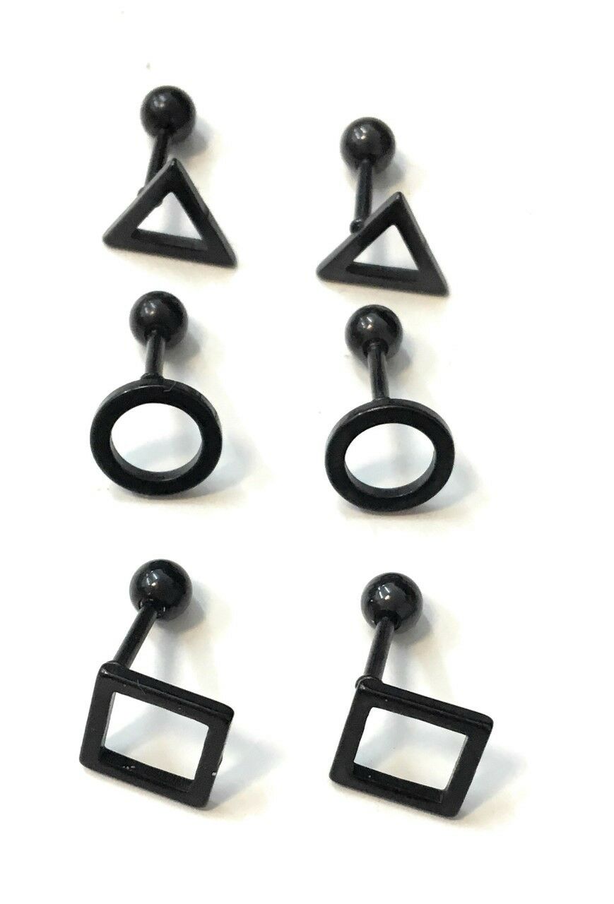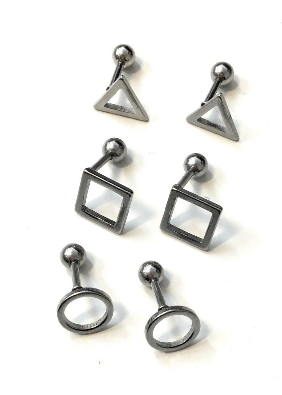 Mens Stainless Steel Earrings Studs - Screw On Geometric Designs Black or Silver